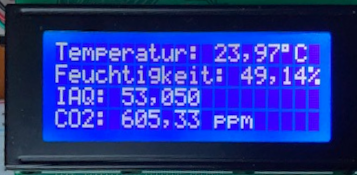 1 2 3 4 5 6 7 8 | #include “bsec.h” #include “LCDIC2.h” // 4‑zeiliges LCD LCDIC2 lcd(0x27, 20, 4); // Objekt (iaqSensor) der Klasse Bsec definieren Bsec iaqSensor; |