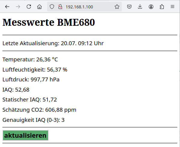 1 2 3 4 5 6 7 8 9 10 11 12 13 14 15 16 17 18 19 20 21 22 23 24 25 26 27 28 29 30 31 32 33 34 35 36 37 38 39 40 41 42 43 44 45 46 47 48 49 50 51 52 53 54 55 56 57 58 59 60 61 62 63 64 65 66 67 68 69 70 71 72 73 74 75 76 77 78 | void SeiteBauen() { // Seite zusammenbauen // Kopf der HTML-Seite: aktualisierung alle 60 Sekunden // kann angepasst werden Nachricht = “<head><meta http-equiv=\“refresh\” content=\“60\”></head>”; Nachricht += “<h1>Messwerte BME680</h1><hr>”; // Datum anzeigen // formatieren: Schrift 14pt, ohne Serifen, Zeilenhöhe Nachricht += “<div style = \“font-size:14pt; font-family:sans-serif; line-height:1.8em\”>”; Nachricht += “Letzte Aktualisierung: “; switch (Zeit.tm_wday) { case 0: Nachricht += “Sonntag”; break; case 1: Nachricht += “Montag”; break; case 2: Nachricht += “Dienstag”; break; case 3: Nachricht += “Mittwoch”; break; case 4: Nachricht += “Donnerstag”; break; case 5: Nachricht += “Freitag”; break; case 6: Nachricht +=“Samstag”; break; } Nachricht += “, “; // wenn der Tag < 10 if (Zeit.tm_mday < 10) Nachricht += “0”; Nachricht += String(Zeit.tm_mday) + “.”; // wen der Monat < 10, Zählung beginnt mit 0 if ((Zeit.tm_mon + 1) < 10) Nachricht += “0”; Nachricht += String(Zeit.tm_mon + 1) + “. “; // Zeit anzeigen // wenn die Stunde < 10 if (Zeit.tm_hour < 10) Nachricht += “0”; Nachricht += String(Zeit.tm_hour) + “:”; // wenn die Minute < 10 if (Zeit.tm_min < 10) Nachricht += “0”; Nachricht+= String(Zeit.tm_min) + ” Uhr<br><hr>”; Nachricht += “Temperatur: ” + Temperatur + ” °C<br>”; Nachricht += “Luftfeuchtigkeit: ” + Luftfeuchtigkeit + ” %<br>”; Nachricht += “Luftdruck: ” + Luftdruck + ” hPa<br>”; Nachricht += “IAQ: ” + IAQ + “<br>”; Nachricht += “Statischer IAQ: ” + StatischerIAQ + “<br>”; Nachricht += “Schätzung CO2: ” + CO2 + ” ppm<br>”; Nachricht += “Genauigkeit IAQ (0–3): ” + String(int(iaqSensor.iaqAccuracy)) + “</div>”; // Button aktualisieren Nachricht += “<hr><input style=\“font-size:16pt; font-weight:bold;”; Nachricht += “background-color:#55A96B;”; Nachricht += “display:block; cursor:pointer;\“type=\“button\””; // IP für den Button aktualisieren (location.href) // muss mit dem Wert für IPAdress übereinstimmen (. statt ‚) // oder der mit DHCP ermittelten IP-Adresse Nachricht += ” onClick =\“location.href=‘http://192.168.1.100’\” value=\“aktualisieren\”>”; Nachricht += “<hr>”; // Nachricht senden -> Seite anzeigen server.send(200, “text/html”, Nachricht); } |
