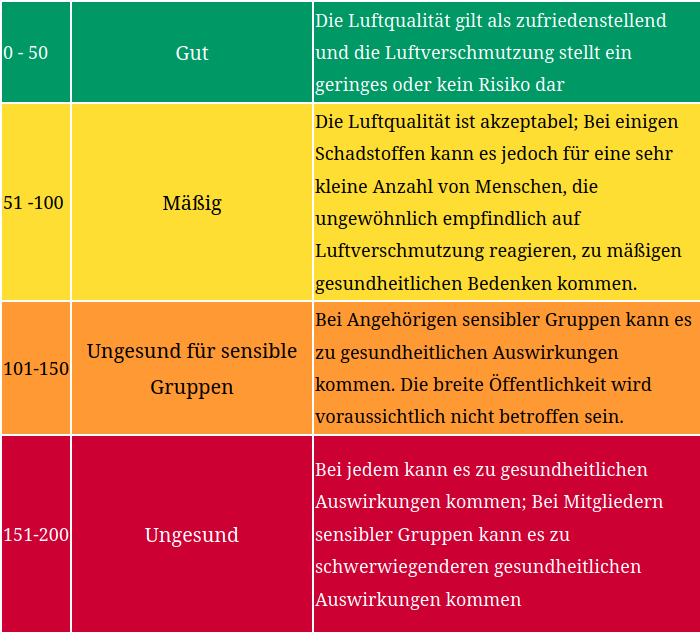 Die Tabelle zeigt den IAQ und die Bewertung der Luftqualität: