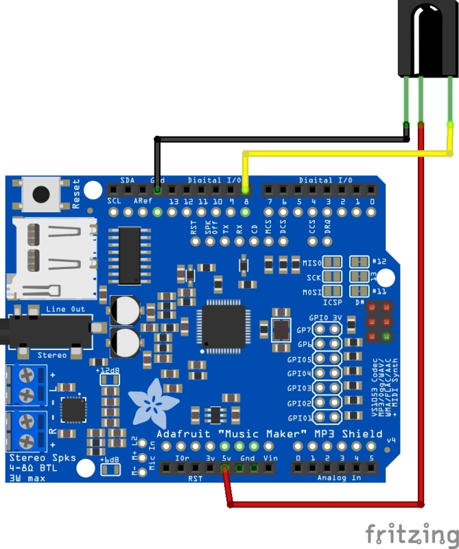 #include "Adafruit_VS1053.h" #include "SD.h" #include "IRremote.hpp" // der Pin, an dem der Infrarot-Empfänger angeschlossen ist int EmpfaengerPin = 8; // Pins VS1053 #define SHIELD_RESET -1 #define SHIELD_CS 7 #define SHIELD_DCS 6 #define CARDCS 4 #define DREQ 3 // Objekt MP3player erzeugen Adafruit_VS1053_FilePlayer MP3player = Adafruit_VS1053_FilePlayer(SHIELD_RESET, SHIELD_CS, SHIELD_DCS, DREQ, CARDCS); // Tastencodes Keyes Fernbedienung #define ZufallWechsel 64 #define PauseWeiter 74 #define TitelVor 67 #define TitelZurueck 68 #define TonLauter 70 #define TonLeiser 21 // Tastencodes alternative Fernbedienung /* #define ZufallWechsel 28 #define PauseWeiter 13 #define TitelVor 90 #define TitelZurueck 8 #define TonLauter 24 #define TonLeiser 82 */ // Tracknummer/Anzahl der Tracks int Track = 1; int TrackMax; int LautstaekeLinks = 20; int LautstaerkeRechts = 20; bool WiedergabePause = true; bool zufaelligeWiedergabe = true; int Bestaetigungston = true; String Titel; void setup() { Serial.begin(9600); // Infrarot-Empfänger starten IrReceiver.begin(EmpfaengerPin); // Player starten if (!MP3player.begin()) { Serial.println(F("VS1053-Shield nicht gefunden ...")); // Programm beenden while (1); } Serial.println(F("VS1053-Shield gefunden ...")); if (!SD.begin(CARDCS)) { Serial.println(F("Start SD-Karte fehlgeschlagen ...")); // Programm beenden while (1); } // Inhalt der SD-Karte lesen und anzeigen DateienAnzeigen(SD.open("/")); MP3player.setVolume(LautstaekeLinks, LautstaerkeRechts); MP3player.useInterrupt(VS1053_FILEPLAYER_PIN_INT); TrackMax = Track - 1; Serial.print(F("Anzahl der Titel: ")); Serial.println(TrackMax); if(Bestaetigungston) MP3player.sineTest(0x44, 5); if(zufaelligeWiedergabe) { randomSeed(millis()); Track = random(1, TrackMax); } else { // wenn der letzte Track gespielt wurde // -> Neustart mit 1 if (Track < TrackMax) Track ++; else Track = 1; } Serial.println("Spiele Track " + String(Track) + ": "); if(Track < 10) Titel = "/track00" + String(Track) + ".mp3"; else Titel = "/track0" + String(Track) + ".mp3"; // testen, ob es sich um eine mp3-Datei handelt if (MP3player.isMP3File(Titel.c_str())) MP3player.startPlayingFile(Titel.c_str()); } void loop() { if (IrReceiver.decode()) { delay(200); // resume -> nächsten Wert lesen IrReceiver.resume(); /* der Empfänger empfängt zwischendurch Signale, die nicht ausgewertet werden können es sollen dehalb nur die korrekt erkannten Tasten ausgewertet werden die Dezimalwerte der korrekten erkannten Tasten liegen zwischen > 0 und < 95 es wird abgefragt, ob das empfangene Kommando decodedIRData.command zwischen 0 und (&&) 95 liegt */ if (IrReceiver.decodedIRData.command > 0 && IrReceiver.decodedIRData.command < 95) { // IrReceiver.decodedIRData.command = Wert der gedrückten Taste // Werte abfragen und anzeigen if (IrReceiver.decodedIRData.command == ZufallWechsel) ZufallSchalten(); if (IrReceiver.decodedIRData.command == PauseWeiter) Pause(); if (IrReceiver.decodedIRData.command == TitelZurueck) vorherigerTitel(); if (IrReceiver.decodedIRData.command == TitelVor) naechsterTitel(); if (IrReceiver.decodedIRData.command == TonLauter) Lauter(); if (IrReceiver.decodedIRData.command == TonLeiser) Leiser(); } } // testen, ob es sich um eine mp3-Datei handelt if (MP3player.isMP3File(Titel.c_str())) { if(!MP3player.playingMusic && WiedergabePause) naechsterTitel(); } } void DateienAnzeigen(File Verzeichnis) { File Datei; while(true) { Datei = Verzeichnis.openNextFile(); // wenn kein Datei mehr vorhanden ist -> while verlassen if (!Datei) { break; } else { Serial.print(Datei.name()); DateienAnzeigen(Datei); Serial.println(Datei.size(), DEC); Track ++; } Datei.close(); } } void Pause() { // wenn die Wiedergabe läuft -> Pause if (!MP3player.paused()) { Serial.println(F("Pause ...")); MP3player.pausePlaying(true); if(Bestaetigungston) MP3player.sineTest(0x50, 5); WiedergabePause = false; } else { Serial.println(F("Weiter ...")); MP3player.pausePlaying(false); WiedergabePause = true; } } void naechsterTitel() { // aktuellen Track stoppen MP3player.stopPlaying(); if(zufaelligeWiedergabe) { randomSeed(millis()); Track = random(1, TrackMax); } else { // wenn der letzte Track gespielt wurde // -> Neustart mit 1 if (Track < TrackMax) Track ++; else Track = 1; } Serial.println("Spiele Track " + String(Track)); if(Track < 10) Titel = "/track00" + String(Track) + ".mp3"; else Titel = "/track0" + String(Track) + ".mp3"; // testen, ob es sich um eine mp3-Datei handelt if (MP3player.isMP3File(Titel.c_str())) MP3player.startPlayingFile(Titel.c_str()); else naechsterTitel(); } void vorherigerTitel() { MP3player.stopPlaying(); if (zufaelligeWiedergabe) { randomSeed(millis()); Track = random(1, TrackMax); } else { if (Track > 1) Track --; else Track = TrackMax; } Serial.println("Spiele Track " + String(Track)); if(Track < 10) Titel = "/track00" + String(Track) + ".mp3"; else Titel = "/track0" + String(Track) + ".mp3"; if (MP3player.isMP3File(Titel.c_str())) MP3player.startPlayingFile(Titel.c_str()); else vorherigerTitel(); } void ZufallSchalten() { MP3player.stopPlaying(); zufaelligeWiedergabe = !zufaelligeWiedergabe; if (zufaelligeWiedergabe) { Serial.println(F("Zufall ein")); if(Bestaetigungston) MP3player.sineTest(0x44, 5); if(Bestaetigungston) MP3player.sineTest(0x44, 5); } else { Serial.println(F("Zufall aus")); if(Bestaetigungston) MP3player.sineTest(0x44, 5); } } void Lauter() { Serial.println(String(LautstaekeLinks) + "," + String(LautstaerkeRechts)); if (LautstaekeLinks > 2) LautstaekeLinks -= 2; if (LautstaerkeRechts > 2) LautstaerkeRechts -= 2; MP3player.setVolume(LautstaekeLinks, LautstaerkeRechts); } void Leiser() { Serial.println(String(LautstaekeLinks) + "," + String(LautstaerkeRechts)); if (LautstaekeLinks < 100) LautstaekeLinks += 2; if (LautstaerkeRechts < 100) LautstaerkeRechts += 2; MP3player.setVolume(LautstaekeLinks, LautstaerkeRechts); } |