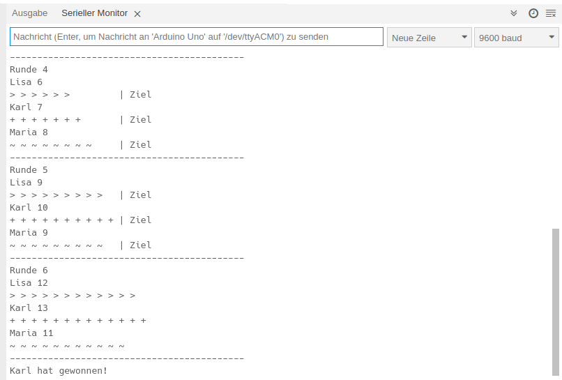1 2 3 4 5 6 7 8 9 10 11 12 13 14 15 16 17 18 19 20 21 22 23 24 25 26 27 28 | int ZufallsZahl(int Minimum, int Maximum) { int Zahl = random(Minimum, Maximum); return Zahl; } void Bildschirmausgabe(String Name, int Schritte, String SchrittZeichen) { // Name der Schnecke und Anzahl der Schritte anzeigen Serial.println(Name + ” ” + String(Schritte)); // entsprechend der Anzahl der Schritte Zeichen anzeigen for (int i = 0; i < Schritte; i++) { Serial.print(SchrittZeichen); } // mit Leerzeichen auffüllen und Ziel anzeigen if (Schritte <= Ziel) { for (int i = Schritte; i < Ziel; i++) { Serial.print(“ ”); } Serial.print(“| Ziel”); } Serial.println(); } |