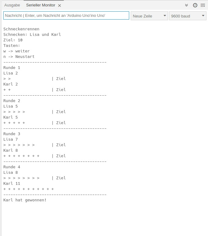 1 2 3 4 5 6 7 8 9 10 11 12 13 14 15 16 17 18 19 | void setup() { Serial.begin(9600); // auf serielle Verbindung warten while (!Serial) {;} // Info über das Spiel Serial.println(“Schneckenrennen”); Serial.println(“Schnecken: ” + Schnecke[0] + ” und ” + Schnecke[1]); // \n = neue Zeile Serial.println(“Ziel: ” + String(Ziel)); Serial.println(“Tasten:\nw -> weiter\nn -> Neustart”); Serial.println(“——————————————-”); // Zufallsgenerator starten randomSeed(analogRead(A0)); } |