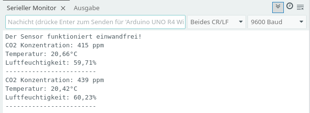1 2 3 4 5 6 7 8 9 10 11 12 13 14 15 16 17 18 19 20 21 22 23 24 25 26 27 28 29 30 31 32 33 34 35 36 37 38 39 40 41 42 43 44 45 46 47 48 49 50 51 52 53 54 55 56 57 58 59 60 61 62 63 64 65 66 67 68 69 70 71 72 73 74 75 76 77 78 79 80 81 82 83 84 85 86 87 88 89 90 91 92 93 94 95 96 | #include “Arduino.h” #include “SensirionI2cScd4x.h” #include “Wire.h” uint16_t sensorStatus = 1; SensirionI2cScd4x sensor; void setup() { // auf Seriellen Monitor warten Serial.begin(9600); while (!Serial) { delay(200); } // UNO R4 WiFi QWIIC-Anschluss // Wire1.begin(); // sensor.begin(Wire1, SCD41_I2C_ADDR_62); // I2C Wire.begin(); sensor.begin(Wire, SCD41_I2C_ADDR_62); // auf Werkseinstellungen zurücksetzen // sensor.performFactoryReset(); delay(30); // Sensor aufwecken sensor.wakeUp(); // periodische Messung stoppen sensor.stopPeriodicMeasurement(); // Voreinstellungen aus dem EEPROM lesen sensor.reinit(); sensor.performSelfTest(sensorStatus); if(sensorStatus == 0) Serial.println(“Der Sensor funktioniert einwandfrei!”); else { Serial.println(“Fehler beim Test des Sensors!”); while(1); } // Höhe des Standorts in m sensor.setSensorAltitude(80); // Temperaturschwankung berücksichtigen sensor.setTemperatureOffset(2.0); // Mittelwert des Luftdrucks hPa *100 // nur sinnvoll, wenn ein präzises Messgerät für einen Vergleich verfügbar ist // sensor.setAmbientPressure(100400);; // Periodic: alle 5 Sekunden messen sensor.startPeriodicMeasurement(); } void loop() { bool SensorBereit = false; uint16_t CO2 = 0; float Temperatur = 0.0; float Luftfeuchtigkeit = 0.0; sensor.getDataReadyStatus(SensorBereit); // wenn der Sensor bereit ist -> Messung durchführen if (SensorBereit) { // periodische Messung sensor.readMeasurement(CO2, Temperatur, Luftfeuchtigkeit); String AnzeigeTemperatur = String(Temperatur); String AnzeigeLuftfeuchtigkeit = String(Luftfeuchtigkeit); AnzeigeTemperatur.replace(“.”, “,”); AnzeigeLuftfeuchtigkeit.replace(“.”, “,”); // Anzeige Serieller Monitor Serial.print(“CO2 Konzentration: ”); Serial.print(CO2); Serial.println(“ ppm”); Serial.print(“Temperatur: ”); Serial.print(AnzeigeTemperatur); Serial.println(“°C”); Serial.print(“Luftfeuchtigkeit: ”); Serial.print(AnzeigeLuftfeuchtigkeit); Serial.println(“%”); Serial.println(“————————”); } } |