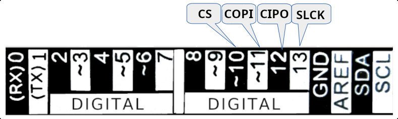 | SLCK (CLK, SCK) | Serial Clock → Taktimpulse, dient der Synchronisation der Datenübertragung | 13 | |