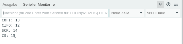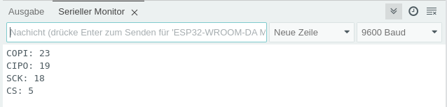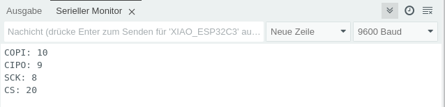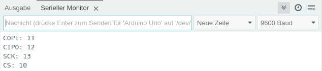 1 2 3 4 5 6 7 8 9 10 11 12 13 14 15 16 17 18 19 20 21 22 23 24 25 26 27 28 | // neue Namen verwenden #define COPI MOSI #define CIPO MISO #define CS SS void setup() { Serial.begin(9600); // auf serielle Verbindung warten while (!Serial); delay(1000); // SPI-Pins anzeigen Serial.print(“COPI: ”); Serial.println(COPI); Serial.print(“CIPO: ”); Serial.println(CIPO); Serial.print(“SCK: ”); Serial.println(SCK); Serial.print(“CS: ”); Serial.println(CS); } void loop() { // bleibt leer, Programm läuft nur einmal } |