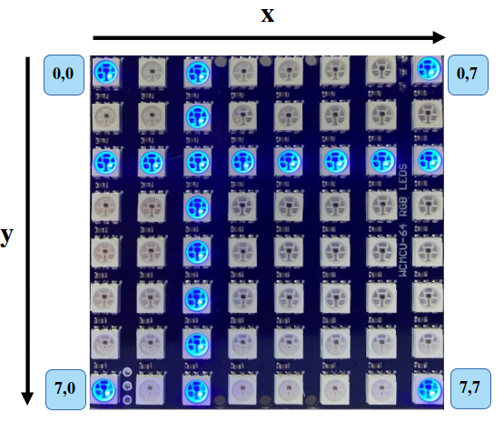 Auf einer RGB-Matrix leuchten zufällig eine Reihe von LEDs. In der Mitte leuchtet beim Start eine gelbe LED. Das Tastenpad „bewegt“ diese LED über die RGB-Matrix und „löscht“ dabei die LED auf der aktuellen Position.