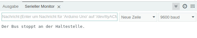 void setup() { Serial.begin(9600); // auf serielle Verbindung warten while (!Serial); delay(500); // die einzelnen Strings String Subjekt = "Der Bus "; String Verb = "stoppt "; String Objekt = "an der Haltestelle."; // Verkettung der Strings zum String Satz String Satz = Subjekt + Verb + Objekt; Serial.println(Satz); } void loop() { // bleibt leer, Programm läuft nur einmal } |