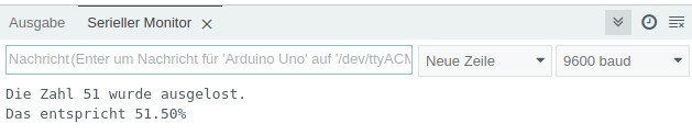void setup() { Serial.begin(9600); // auf serielle Verbindung warten while (!Serial); delay(500); int Zahl = 51; float Prozent = 51.5; // Verkettung unterschiedlicher Variablen // durch Umwandlung zu Strings Serial.println("Die Zahl " + String(Zahl) + " wurde ausgelost."); Serial.print("Das entspricht " + String(Prozent) + "%"); } void loop() { // bleibt leer, Programm läuft nur einmal } |