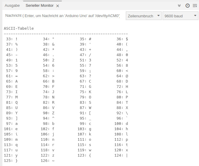 1 2 3 4 5 6 7 8 9 10 11 12 13 14 15 16 17 18 19 20 21 22 23 24 25 26 27 28 29 30 31 32 33 34 35 36 37 38 39 40 41 42 43 44 45 46 47 48 49 50 51 52 53 54 55 | bool BuchstabeTesten; String Eingabe = “”; void setup() { Serial.begin(9600); // auf serielle Verbindung warten while (!Serial); delay(1000); Serial.println(“Buchstaben oder Zahlen eingeben: ”); } void loop() { while (Serial.available() > 0) { // Eingabe im Seriellen Monitor lesen char Zeichen = Serial.read(); /* Eingabe auf Buchstaben prüfen den eingegebene Buchstabe dem String Eingabe hinzufügen (+=) ZahTesten auf true setzen */ if (isAlpha(Zeichen)) { Eingabe += Zeichen; BuchstabeTesten = true; } /* wenn Enter/Senden gedrückt (‘\n’) und (&&) in der Eingabe ein Buchstabe vorhanden ist (BuchstabeTesten = true) */ if (Zeichen == ‘\n’ && BuchstabeTesten) { // Länge des Strings testen und Ausgabe anpassen int Laenge = Eingabe.length(); // wenn nur ein Buchstabe eingegeben wurde if (Laenge == 1) Serial.println(“in der Eingabe ist der Buchstabe ” + Eingabe + ” enthalten!”); // wenn mehrere Buchstaben eingegeben wurden else Serial.println(“in der Eingabe sind die Buchstaben ” + Eingabe + ” enthalten!”); // Variablen zurücksetzen BuchstabeTesten = false; Eingabe = “”; } // wenn in der Eingabe kein Buchstabe enthalten ist (!BuchstabeTesten -> BuchstabeTesten = false) else if (Zeichen == ‘\n’ && !BuchstabeTesten) Serial.println(“in der Eingabe ist kein Buchstabe enthalten!”); } } |