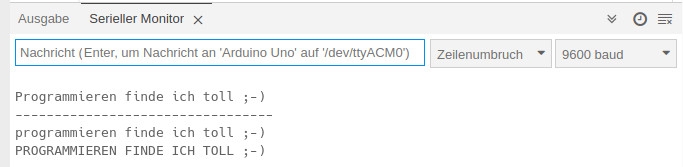 1 2 3 4 5 6 7 8 9 10 11 12 13 14 15 16 17 18 19 20 21 22 23 24 25 | void setup() { Serial.begin(9600); // auf serielle Verbindung warten while (!Serial); delay(1000); String BeispielString = “Programmieren finde ich toll ;-)”; Serial.println(BeispielString); Serial.println(“———————————”); // Kleinbuchstaben BeispielString.toLowerCase(); Serial.println(BeispielString); // Großbuchstaben BeispielString.toUpperCase(); Serial.println(BeispielString); } void loop() { // bleibt leer, Programm läuft nur einmal } |