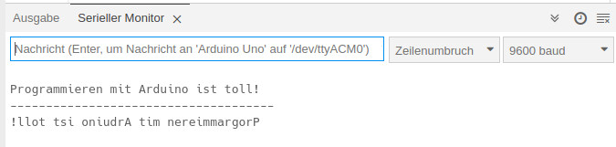 1 2 3 4 5 6 7 8 9 10 11 12 13 14 15 16 17 18 19 20 21 22 23 24 25 26 27 28 29 30 31 32 33 34 35 36 37 38 39 | void setup() { Serial.begin(9600); // auf serielle Verbindung warten while (!Serial); delay(1000); String Satz = “Programmieren mit Arduino ist toll!”; // Satz.length() -> Anzahl der Zeichen des Strings Satz ermitteln // Array definieren char SatzArray[Satz.length()]; // char-Array Satz erstellen Satz.toCharArray(SatzArray, Satz.length() + 1); Serial.println(); // Array anzeigen for (int i = 0; i < sizeof(SatzArray); i++) { Serial.print(SatzArray[i]); } Serial.println(); Serial.println(“————————————-”); // Array rückwärts anzeigen, letztes Zeichen entfernen for (int i = sizeof(SatzArray) - 1; i >= 0; i–) { Serial.print(SatzArray[i]); } } void loop() { // bleibt leer, Programm läuft nur einmal } |