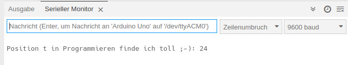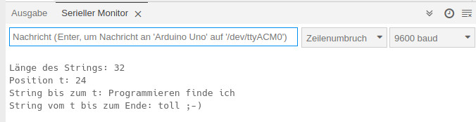 1 2 3 4 5 6 7 8 9 10 11 12 13 14 15 16 17 18 19 20 | void setup() { Serial.begin(9600); // auf serielle Verbindung warten while (!Serial); delay(1000); String BeispielString = “Programmieren finde ich toll ;-)”; // das t suchen int Suche = BeispielString.indexOf(“t”); Serial.print(“Position t in ” + BeispielString + “: ”); Serial.println(Suche); } void loop() { // bleibt leer, Programm läuft nur einmal } |