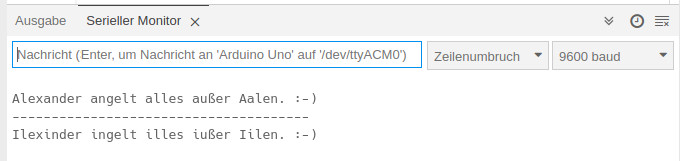 1 2 3 4 5 6 7 8 9 10 11 12 13 14 15 16 17 18 19 20 21 22 23 24 25 26 | void setup() { Serial.begin(9600); // auf serielle Verbindung warten while (!Serial); delay(1000); String BeispielString = “Alexander angelt alles außer Aalen. :-)”; Serial.println(BeispielString); Serial.println(“————————————–”); // Groß-/Kleinbuchstaben suchen und ersetzen for (int i = 0; i < BeispielString.length(); i++) { // Suchstring und Ersatzstring in einfachen Anführungszeichen if (BeispielString.charAt(i) == ‘A’) BeispielString.setCharAt(i, ‘I’); if (BeispielString.charAt(i) == ‘a’) BeispielString.setCharAt(i, ‘i’); } Serial.println(BeispielString); } void loop() { // bleibt leer, Programm läuft nur einmal } |
