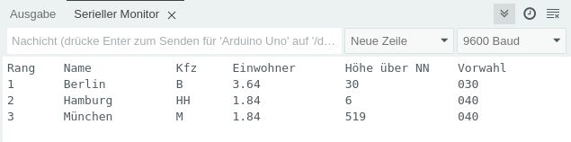1 2 3 4 5 6 7 8 9 10 11 12 13 14 15 16 17 18 19 20 21 22 23 24 25 26 27 28 29 30 31 32 33 34 35 36 37 38 39 40 41 42 43 44 45 46 47 48 49 50 51 52 53 54 55 56 57 58 59 60 61 62 63 64 65 66 67 68 69 | struct Stadt { int Rang; String Name; String KFZ_Kennzeichen; float Einwohner; String Vorwahl; int Hoehe; }; Stadt Berlin = { 1, “Berlin”, “B”, 3.64, “030”, 30 }; Stadt Hamburg = { 2, “Hamburg”, “HH”, 1.84, “040”, 6 }; Stadt Muenchen = { 3, “München”, “M”, 1.84, “040”, 519 }; void setup() { Serial.begin(9600); // auf serielle Verbindung warten while (!Serial); delay(1000); // Formatierung mit Tabstopps (\t) Serial.println(“Rang\tName\t\tKfz\tEinwohner\tHöhe über NN\tVorwahl”); ZeigeDaten(Berlin); ZeigeDaten(Hamburg); ZeigeDaten(Muenchen); } void loop() { // bleibt leer, Programm läuft nur einmal } void ZeigeDaten(struct Stadt StadtName) { Serial.print(String(StadtName.Rang) + “\t”); Serial.print(StadtName.Name + “\t\t”); Serial.print(StadtName.KFZ_Kennzeichen + “\t”); Serial.print(String(StadtName.Einwohner) + “\t\t”); Serial.print(String(StadtName.Hoehe) + “\t\t”); Serial.println(StadtName.Vorwahl); } |
