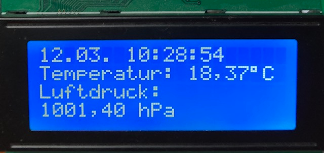 Der Sen­sor BMP280 kann die Tem­per­atur messen und den Luft­druck bes­tim­men. Er wird über ⇒I2C anges­teuert. Auf einem LCD sollen Tem­per­atur und Luft­druck angezeigt wer­den.