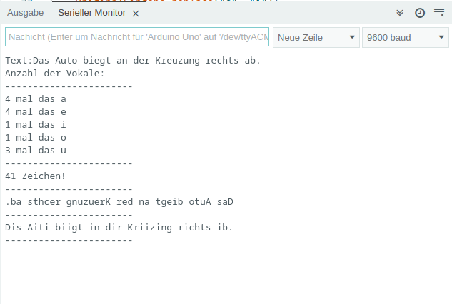 In diesem Programm soll die Eingabe im Seriellen Monitor dazu verwendet werden, in einem Satz die Anzahl der Vokale zu zählen und anzuzeigen. Außerdem erfährst du einiges über Zeichenketten.