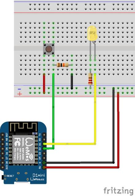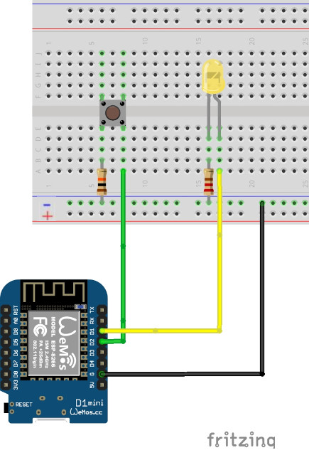 1 2 3 4 5 6 7 8 9 10 11 12 13 14 15 16 17 18 | int Taster = D2; int Status = 0; void setup() { // die Taster werden als INPUT (Eingang) deklariert pinMode(Taster, INPUT); Serial.begin(9600); } void loop() { // Taster für die gelbe LED abfragen Status = digitalRead(Taster); if (Status) Serial.println(“Zustand des Tasters: HIGH” ); else Serial.println(“Zustand des Tasters: LOW” ); delay(500); } |