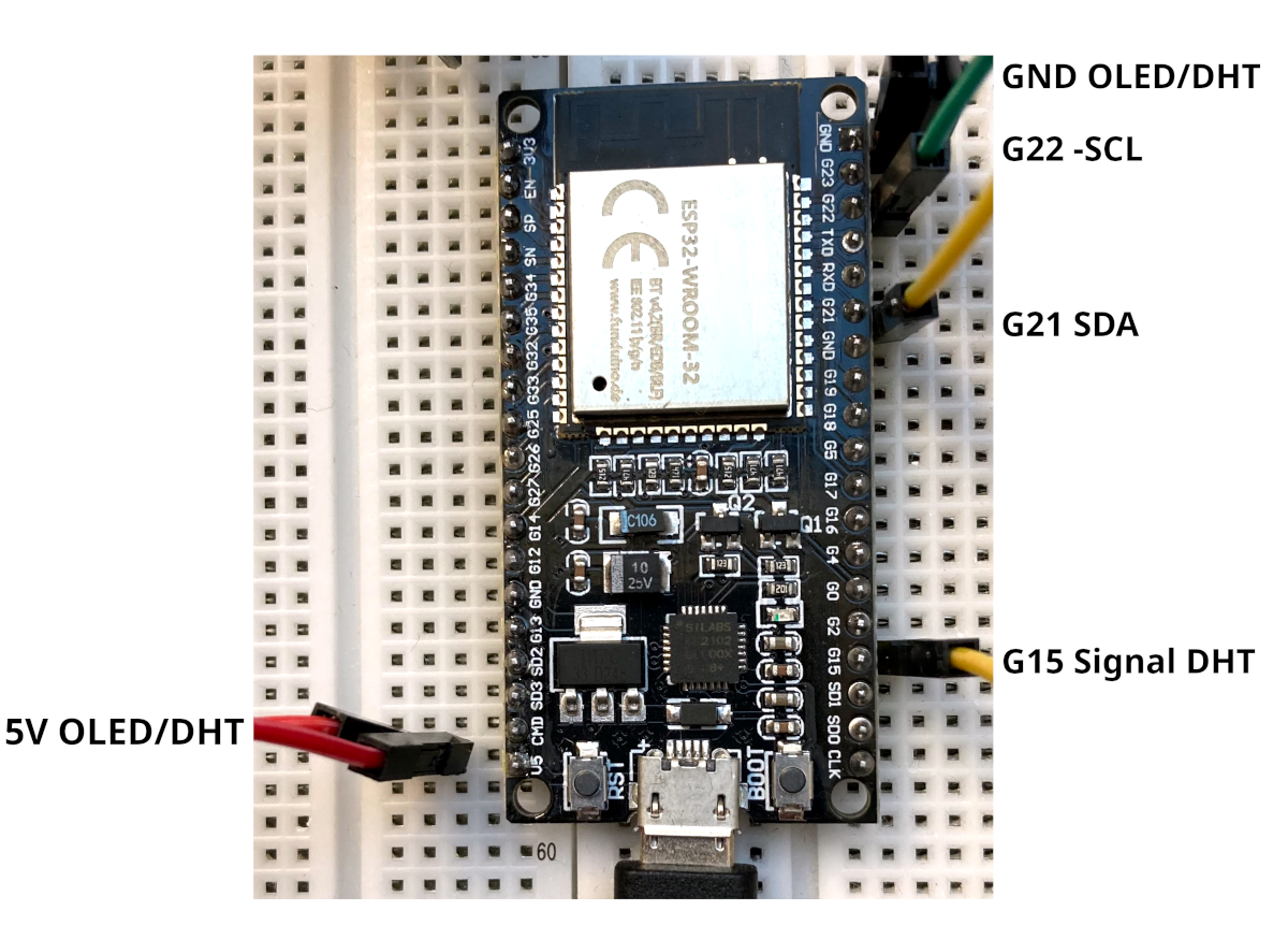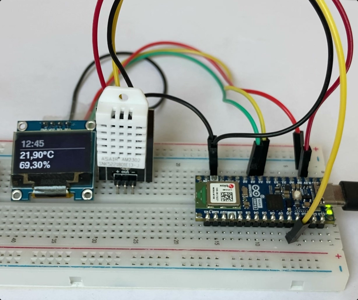 Mit dem Sensor DHT11/DHT22 werden Temperatur und Luftfeuchtigkeit gemessen, das Ergebnis wird auf einem OLED angezeigt. Die über einen Zeitserver ermittelte Zeit wird ebenfalls auf dem OLED dargestellt. Als Controller wird ein Arduino Nano ESP32 (oder ESP32-Wroom/Wemos D1 Mini) verwendet.