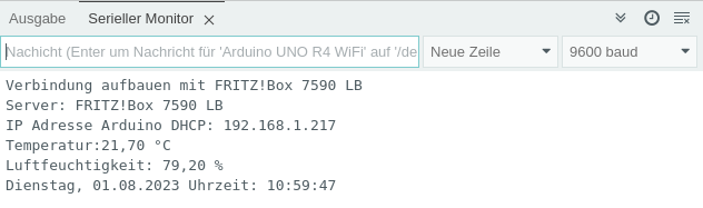 Im Seriellen Mon­i­tor wer­den die ver­wen­dete IP-Adresse und die Mess­werte für Tem­per­atur und Luft­feuchtigkeit angezeigt.