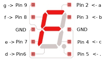 Die Zahlen, die dargestellt wer­den sollen, wer­den als Binär­w­ert notiert. Eine 1 ste­ht für Seg­ment ein­schal­ten, eine 0 zeigt das Seg­ment nicht an. Die Rei­hen­folge der Zif­fern entspricht der Rei­hen­folge der Pins. Die erste Zif­fer schal­tet Pin 2, die zweite Pin 3 und die let­zte Pin 9.