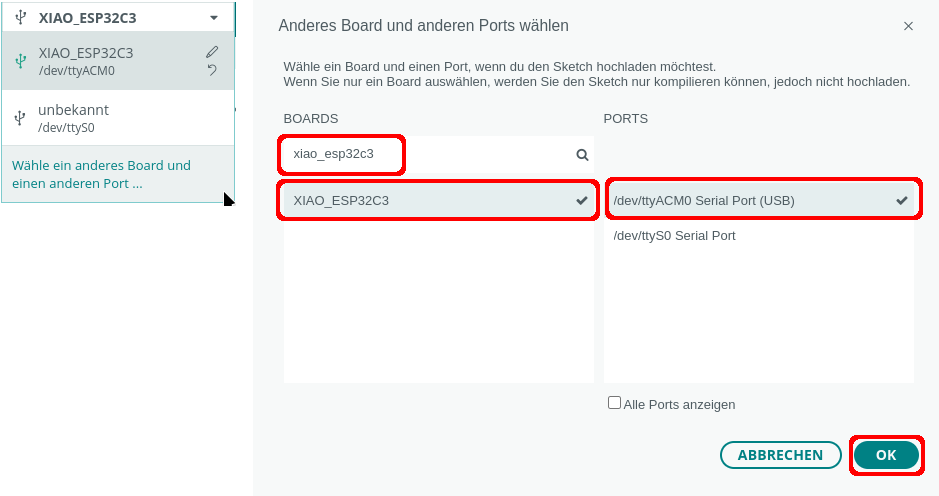 Wenn der XIAO-ESP32-C3 nicht automatisch erkannt wurde, klicke auf “Wähle ein anderes Board und einen anderen Port” und suche nach xiao_esp32c3. Je nach Betriebssystem wird der USB-Port eine andere Bezeichnung haben.