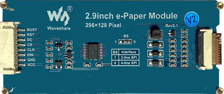 Das Waveshare 2,9 Zoll E-Ink Display hat eine Auflösung von 296×128 Pixeln und kann die Farben weiß und schwarz darstellen.