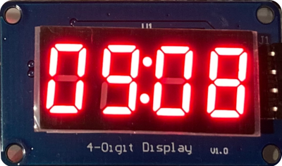 Mit einem RTC- Mod­ul (RealTimeClock) soll die Uhrzeit auf einem 4‑stelligen 7‑Seg­ment-Mod­ul angezeigt wer­den. Nach ein­er kurzen Pause wird die Tem­per­atur angezeigt und anschließend wieder die Uhrzeit dargestellt.