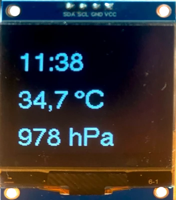 Auf einem OLED sollen Zeit Wetterdaten angezeigt werden. Die Zeit wird mit dem RTC-Modul DS3231 gemessen, die Wetterdaten stellen entweder ein BME280 oder ein BMP280 zur Verfügung